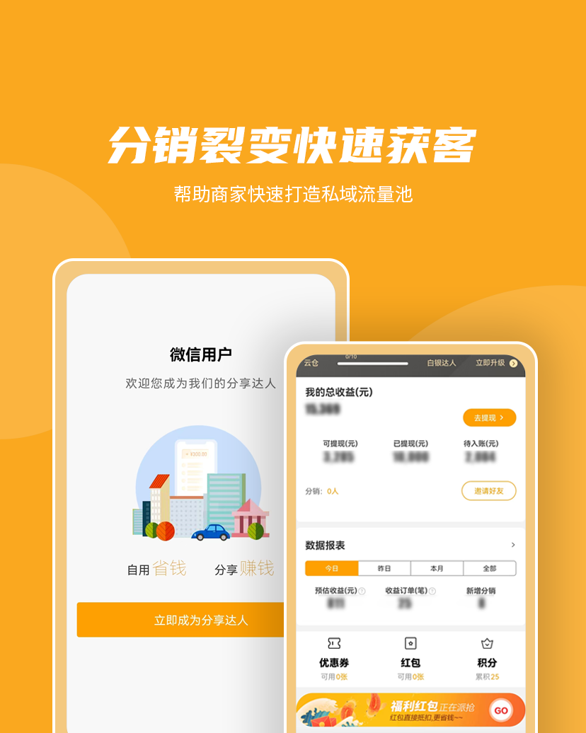 亮点: 专业线上分销系统,百余种营销玩法,帮助商家快速分销获客